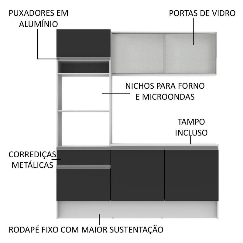 O acabamento interno e externo é branco. As portas e a frente da gaveta são pretas. A Pintura em Poliéster Protetor consiste na aplicação de 7 camadas de proteção resistentes a álcool, água e calor. Além disso, o processo é ecológico, isento de vapores que vão para a atmosfera.Especificações Técnicas: