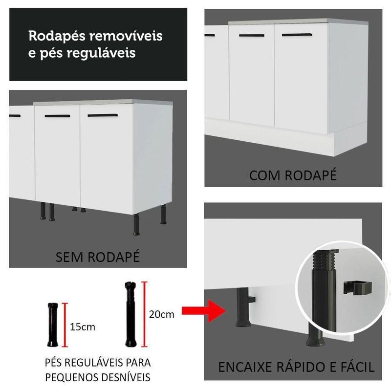 Para completar, a cozinha conta com pés reguláveis em PVC e rodapés removíveis em MDP de encaixe fácil, para facilitar na hora da limpeza.