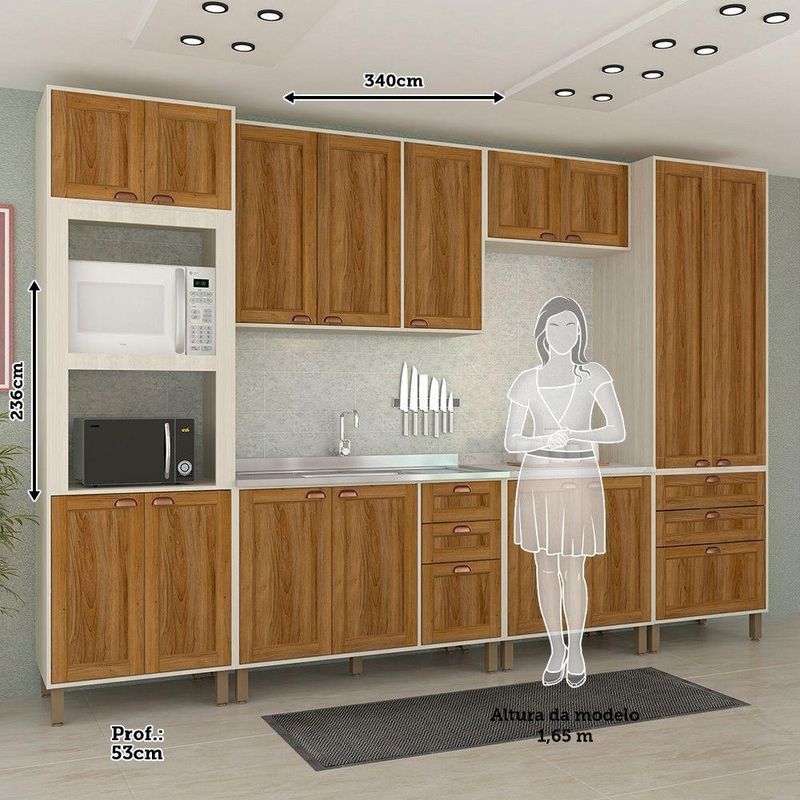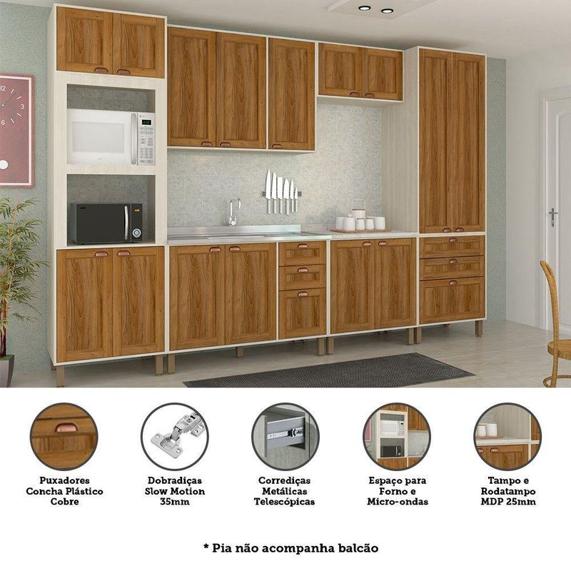 Desenvolvida com materiais de altissima qualidade, a Cozinha Sofia oferece excelente distribuicao de espaco interno, dobradicas Slowmotion com amortecedor incorporado para fechamento suave das portas. Puxadores plasticos na cor Bronze e pes em Ps (poliestireno) na cor champagne com regulagem de altura.