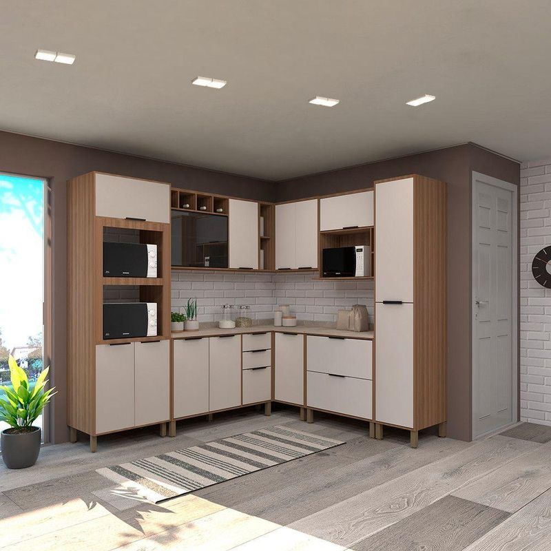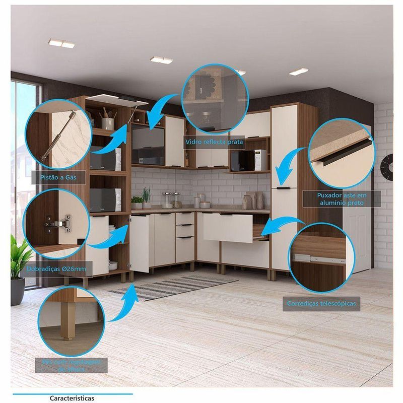 Desenvolvida com materiais de excelencia, a Cozinha Aspen oferece excelente distribuicao de espaco interno para sua organizacao. E fabricada em 100 MDP e possui acabamento das portas em BP oferecendo durabilidade, resistencia a riscos e facil manutencao. Conta com puxadores tipo Alca em Aluminio Preto dando um toque especial de classe e sofisticacao ao ambiente.
