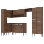 - Seis módulos independentes: paneleiro com duas portas; balcão de canto reto; armário aéreo de canto reto com duas portas e adega; balcão de pia; armário aéreo com duas portas e dois nichos; paneleiro duplo com quatro portas.