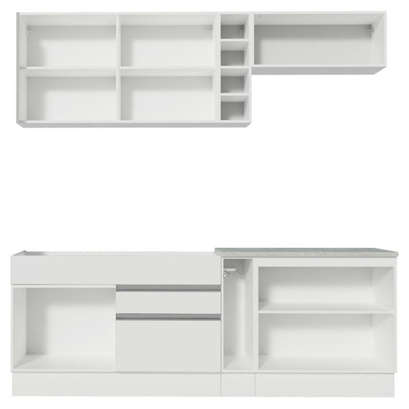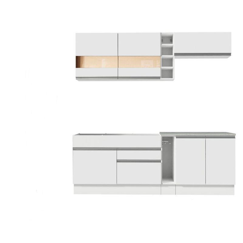 - Itens inclusos: Um Balcão de Pia com duas gavetas e uma porta (Não acompanha tampo deste balcão) | Um Porta-Panos com tampo em MDP | Um Balcão com duas portas e tampo em MDP | Um Armário Aéreo com duas portas com detalhe em vidro reflex | Um Armário Aéreo com uma porta basculante | Uma Adega
