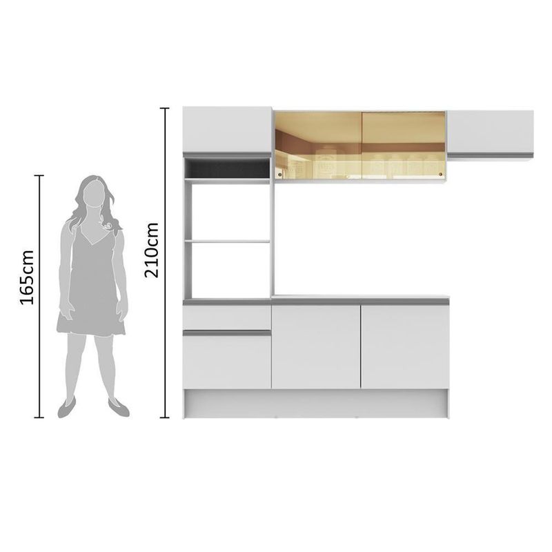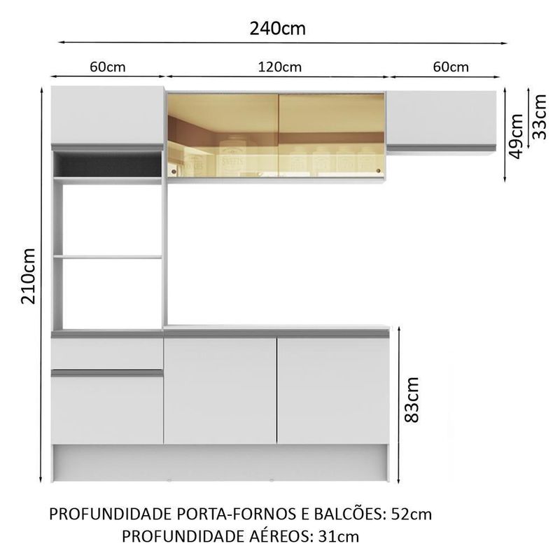 - Medidas totais: 240 cm de largura e 210 cm de altura; profundidades de 31 cm nos aéreos e 52 cm nos balcões e na torre