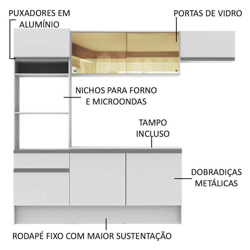 - Itens inclusos: Uma (1) torre com nichos para forno e micro-ondas, com uma (1) gaveta e duas (2) portas, sendo uma basculante com um (1) balcão agregado de 120 cm com duas (2) portas | Um (1) aéreo de 120 cm com portas deslizantes em vidro reflex | Um (1) tampo de MDP branco para balcão de pia de 120 cm x 52 cm | Um (1) aéreo de 60 cm com porta basculante