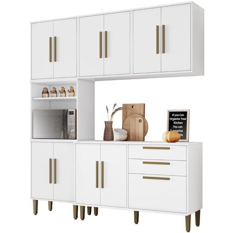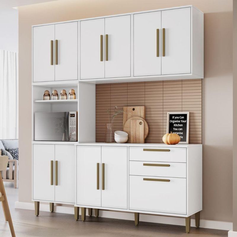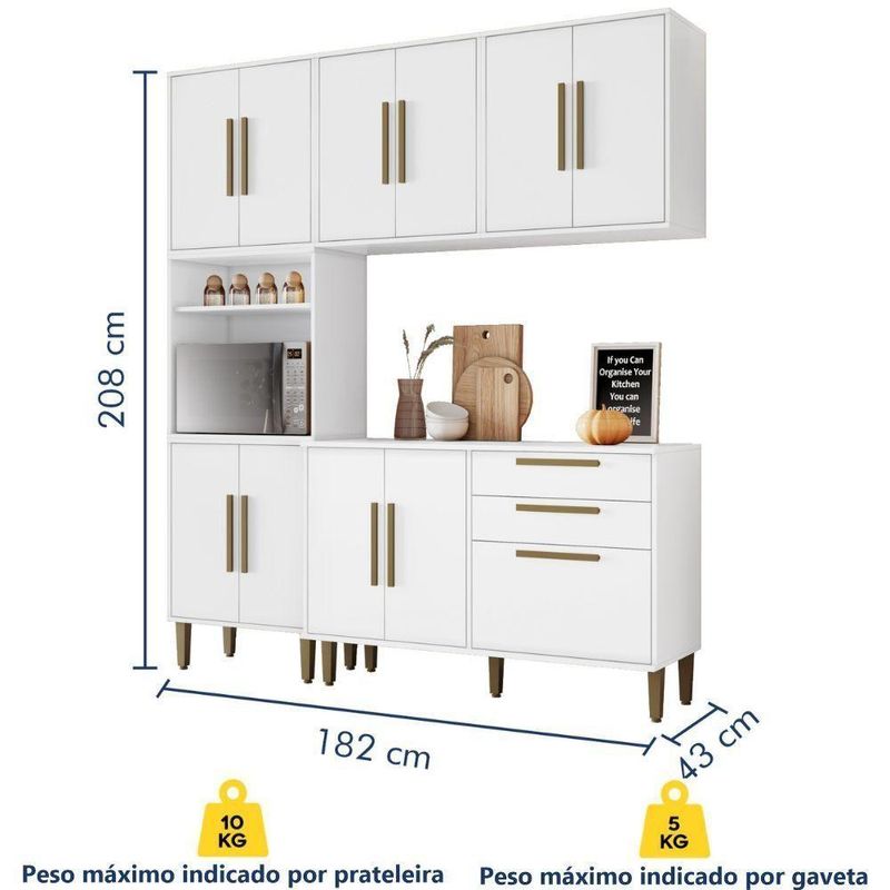 Cozinha Completa Lorena 11 Portas 2 Gavetas Branco Kaiki Móveis Funcionalidade e elegância em um só ambiente! Essa cozinha foi planejada para oferecer praticidade no dia a dia, com armários espaçosos, design moderno e acabamentos de qualidade que combinam com qualquer estilo de decoração. Perfeita para quem busca organização, durabilidade e charme, ela transforma sua rotina culinária em uma experiência ainda mais agradável. Especificações - Medida total do Produto: 208 (A) x 182 (L) x 43 (P) cm; - Torre Quente: 208 (A) x 60,75 (L) x 33,5 (P) cm; - Balcão: 80,5 (A) x 119,5 (L) x 43 (P) cm; - 2 Aéreo 2 Portas: 63,5 (A) x 60,75 (L) x 33,5 (P) cm; - Cor: Branco; - Estrutura: MDP; - Tampo: 15 mm; - Acabamento: Pintura UV; - Portas: Sim, 11, sendo 10 de bater, com dobradiça metálica e 1 porta basculante com pistão a gás e puxadores em MDF; - Gavetas: Sim, 2, com corrediças telescópicas e puxadores em MDF; - Prateleiras: Sim, 6; - Espaço para Forno: 41 (A) x 56 (L) x 33 (P) cm; - Pés: Sim, com regulagem de altura; - Peso do Produto: 106 kg; - Necessita de Montagem: Sim; - Complexidade da Montagem: Alto; - Acompanha: Manual de Montagem; Kit Ferragens; Informações Importantes - A disponibilidade se refere ao prazo para o envio do produto encomendado. - A cor do produto pode variar em relação à foto devido a fatores como tratamento de imagem e calibração do monitor. - Detalhes e acabamentos podem não ser evidentes nas imagens, que são meramente ilustrativas. - Objetos que aparecem nas fotos não acompanham o produto. - A instalação deve ser realizada por um técnico de confiança do cliente, pois não nos responsabilizamos por montagens. - A transportadora não realiza entregas com subida de escada ou içamento de produtos; despesas desse tipo são de responsabilidade do cliente. - Limpeza e cuidados, limpeza com flanela ou pano macio. Não utilizar produtos químicos, lustra móveis, abrasivos, álcool ou limpeza a vapor. Evitar exposição prolongada ao sol, pois pode causar ressecamento de sua estrutura, danificando-o. Cor: Branco | Tonalidade: Branco | Produto: Armário
