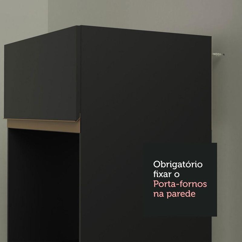 O acabamento preto e amadeirado Rustic. A parte interna das gavetas e as costas da cozinha são brancas. O processo é feito em Pintura Poliéster ecológica de alta resistência, que dá maior destaque à tonalidade e conserva a beleza do móvel por mais tempo.