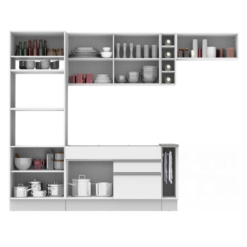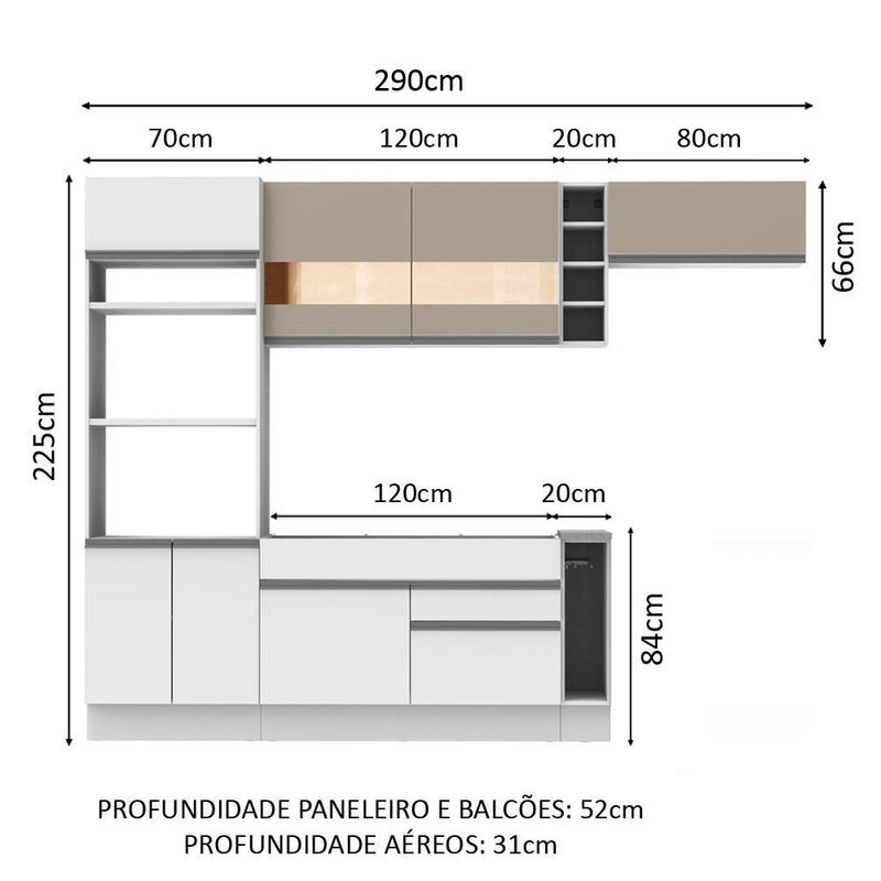 Cozinha Completa Madesa Safira com Armário e Balcão (sem Tampo e Pia)A Cozinha Safira da linha Glamy é uma das campeãs de vendas da Madesa. Se destaca por parecer uma cozinha planejada com ótimo aproveitamento dos espaços internos.As gavetas possuem corrediça telescópica e todas as portas possuem dobradiças com amortecimento para o fechamento suave. O armário aéreo maior possui detalhe em vidro reflex nas portas, diferencial que traz beleza e sofisticação ao produto.O acabamento da estrutura interna e externa e das portas é branco. As portas do aéreo de 120 cm são em pintura Crema. Todos os acabamentos são feitos em Pintura Poliéster de alta resistência, processo ecológico e que aumenta a qualidade e durabilidade do produto.Especificações Técnicas