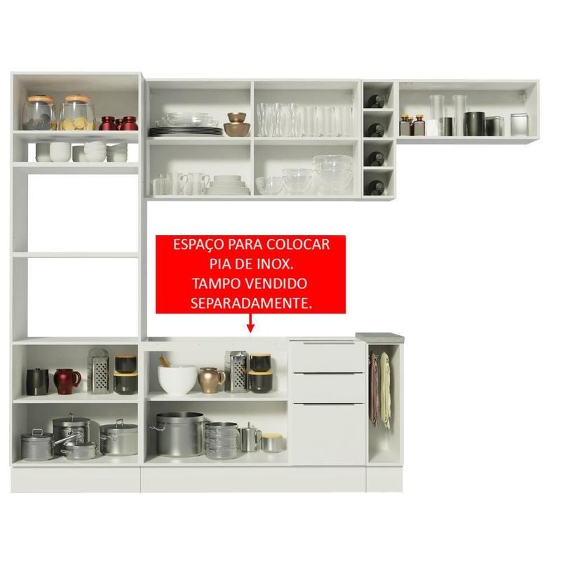 Tem espaço pra tudo neste modelo: forno, micro-ondas, garrafas, louças, eletros, panos e o que mais você imaginar. É a escolha perfeita para deixar a cozinha muito mais organizada e funcional.