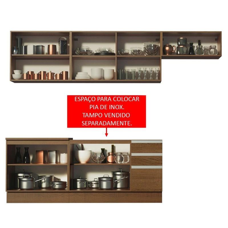 - Itens inclusos: Um balcão de 80 cm com duas portas e tampo | Um aéreo de 80 cm com duas portas | Um balcão de pia de 120 cm de largura com duas portas e três gavetas, sendo uma maior (não acompanha o tampo deste balcão) | Um aéreo de 120 cm com duas portas com detalhe em vidro reflex | Um aéreo de 80 cm com uma porta basculante