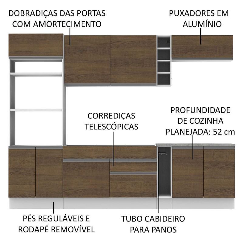 - As gavetas possuem corrediças telescópicas e todas as portas possuem amortecedor para o fechamento suave.
