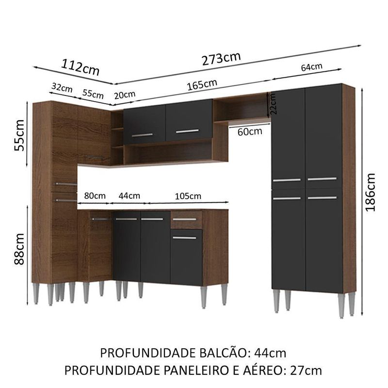 - Dimensões do Produto (L/LxAxP): 112 cm (Lado Equerdo) / 273 cm (Lado Direito) X 186 cm X 44 cm (Paneleiros e Aéreos com 27 cm de Profundidade)