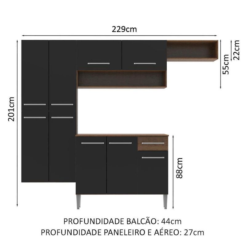 - Dimensões do Produto (LxAxP): 229 cm X 201 cm X 44 cm (Paneleiros e Aéreos com 27 cm de Profundidade)