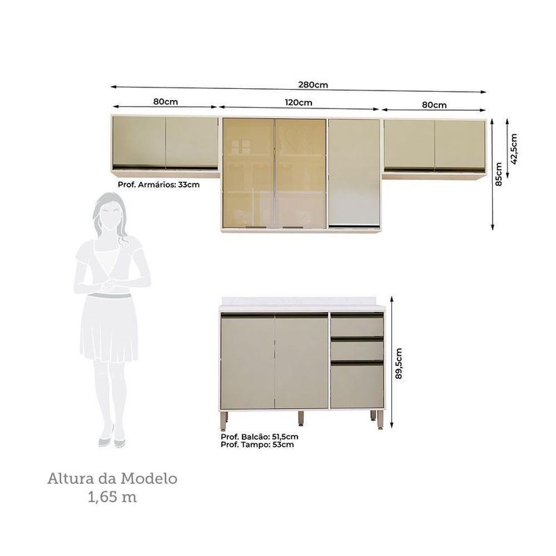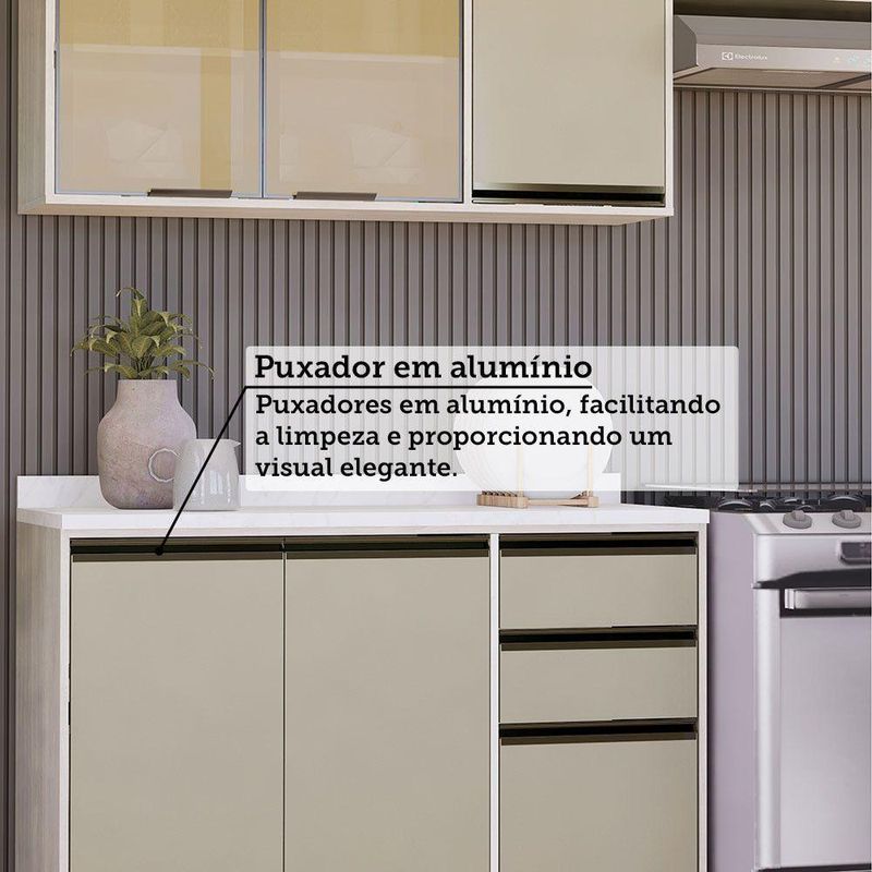 A Cozinha Linea foi desenvolvido aliando beleza e praticidade ao seu ambiente. As portas embutidas remetem ao planejado, ainda conta com acessorios requintados como dobradicas em 35mm com amortecimento Slowmotion, dobradica com amortecedor incorporado para fechamento suave de portas, puxadores tipo gola em perfil aluminio na Inox e pes em PS (poliestireno) na champagne. Possui gavetas com corredicas metalicas telescopicas em tres estagios, para abertura total. Perfeito para sua cozinha.