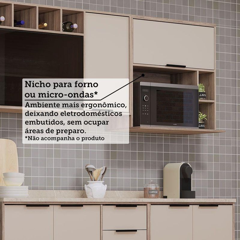 Espaco para Forno ou Micro-ondas. ATENCAO: Na utilizacao de FORNO ELETRICO/GAS e obrigatoria a retirada do fundo (risco de super aquecimento). As dimensoes maximas do forno devem respeitar a margem de respiro, necessitando folga de 5cm entre forno e laterais do movel.