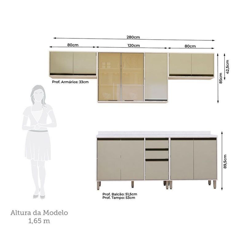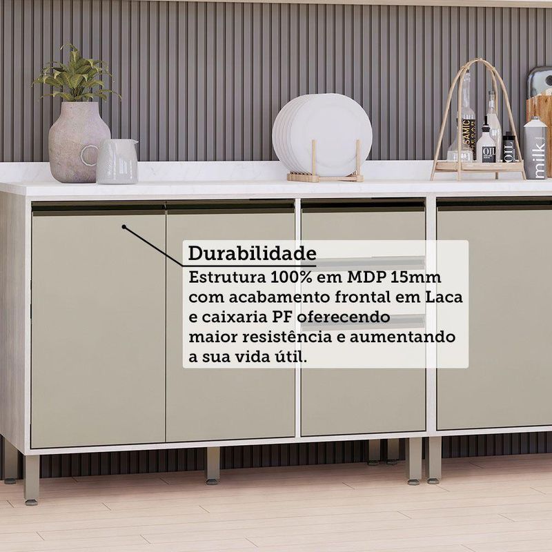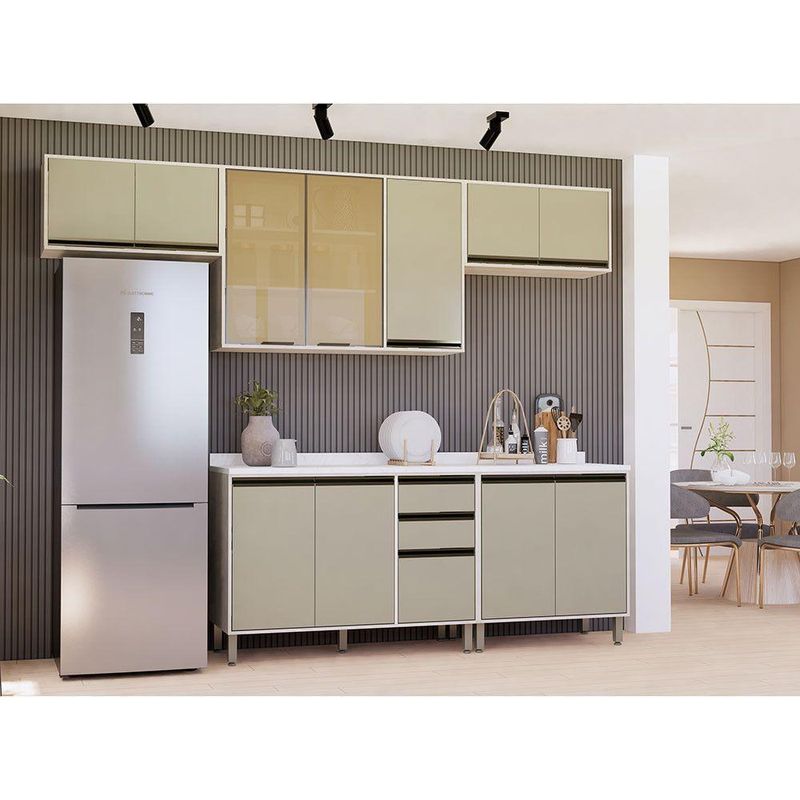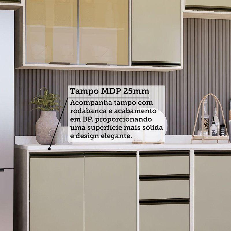 A Cozinha Linea foi desenvolvido aliando beleza e praticidade ao seu ambiente. As portas embutidas remetem ao planejado, ainda conta com acessorios requintados como dobradicas em 35mm com amortecimento Slowmotion, dobradica com amortecedor incorporado para fechamento suave de portas, puxadores tipo gola em perfil aluminio na Inox e pes em PS (poliestireno) na champagne. Possui gavetas com corredicas metalicas telescopicas em tres estagios, para abertura total. Perfeito para sua cozinha.