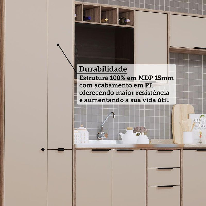 Desenvolvida com materiais de excelencia, a Cozinha Aspen oferece excelente distribuicao de espaco interno para sua organizacao. E fabricada em 100 MDP e possui acabamento das portas em BP oferecendo durabilidade, resistencia a riscos e facil manutencao. Conta com puxadores tipo Alca em Aluminio Preto dando um toque especial de classe e sofisticacao ao ambiente.