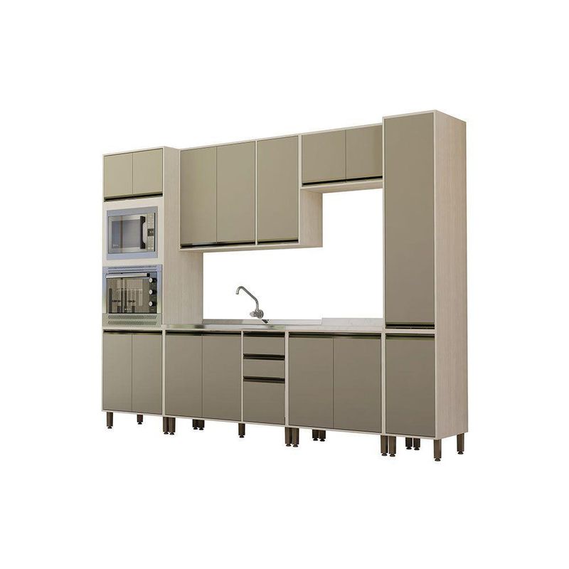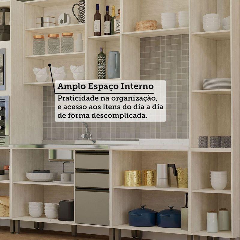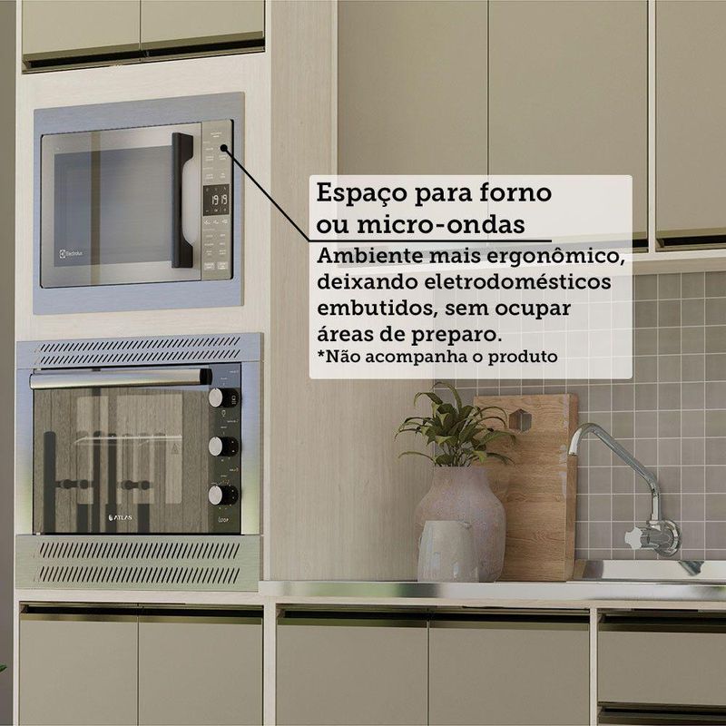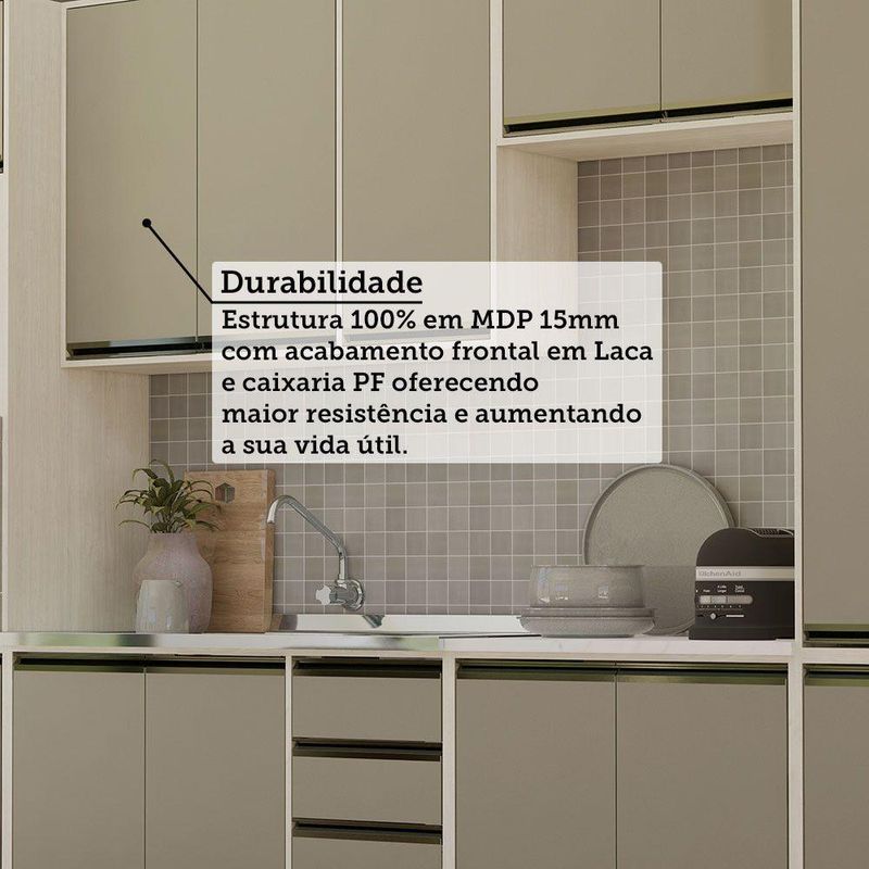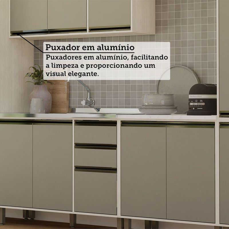 A Cozinha Linea foi desenvolvido aliando beleza e praticidade ao seu ambiente. As portas embutidas remetem ao planejado, ainda conta com acessorios requintados como dobradicas em 35mm com amortecimento Slowmotion, dobradica com amortecedor incorporado para fechamento suave de portas, puxadores tipo gola em perfil aluminio na Inox e pes em PS (poliestireno) na champagne. Possui gavetas com corredicas metalicas telescopicas em tres estagios, para abertura total. Perfeito para sua cozinha.