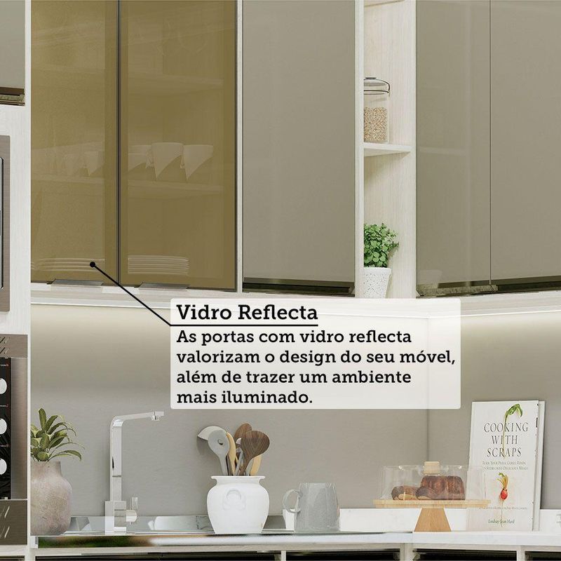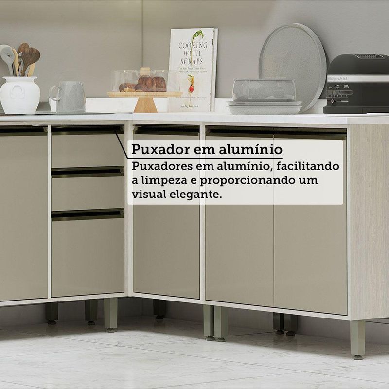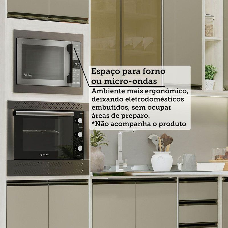 A Cozinha Linea foi desenvolvido aliando beleza e praticidade ao seu ambiente. As portas embutidas remetem ao planejado, ainda conta com acessorios requintados como dobradicas em 35mm com amortecimento Slowmotion, dobradica com amortecedor incorporado para fechamento suave de portas, puxadores tipo gola em perfil aluminio na Inox e pes em PS (poliestireno) na champagne. Possui gavetas com corredicas metalicas telescopicas em tres estagios, para abertura total. Perfeito para sua cozinha.
