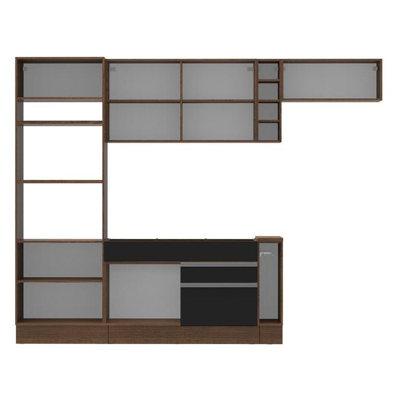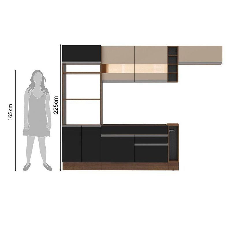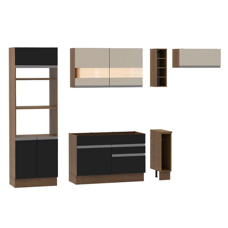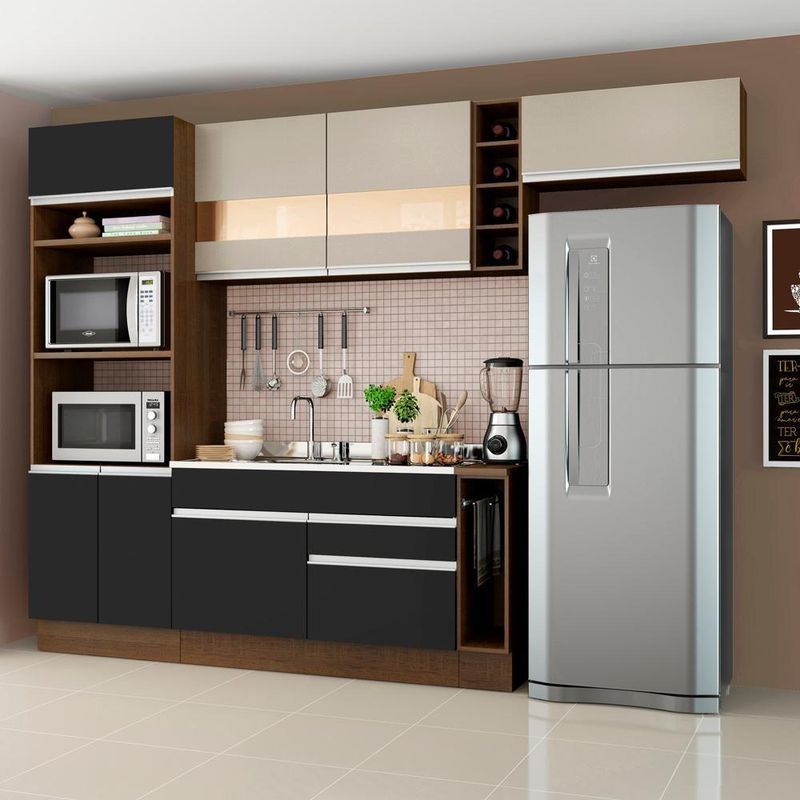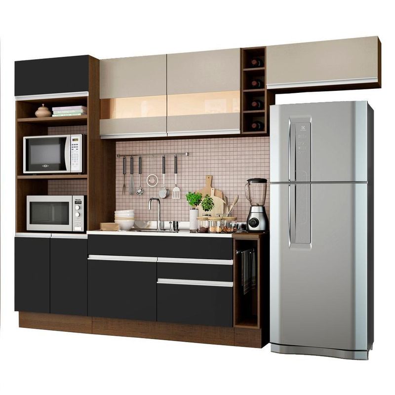 - Itens inclusos: 1 torre quente com dois nichos para forno e micro-ondas | 1 nicho menor e três portas sendo uma basculante | 1 balcão de pia com duas gavetas e uma porta, não acompanha tampo | 1 balcão porta panos com tampo Mood | 1 armário aéreo com duas portas com detalhe em vidro reflex | 1 mini adega | 1 armário aéreo com uma porta basculante