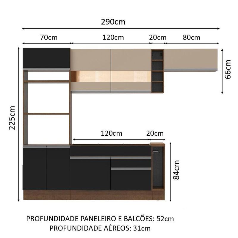 - Profundidade: Balcões e paneleiro 52cm | Aéreos 31cm