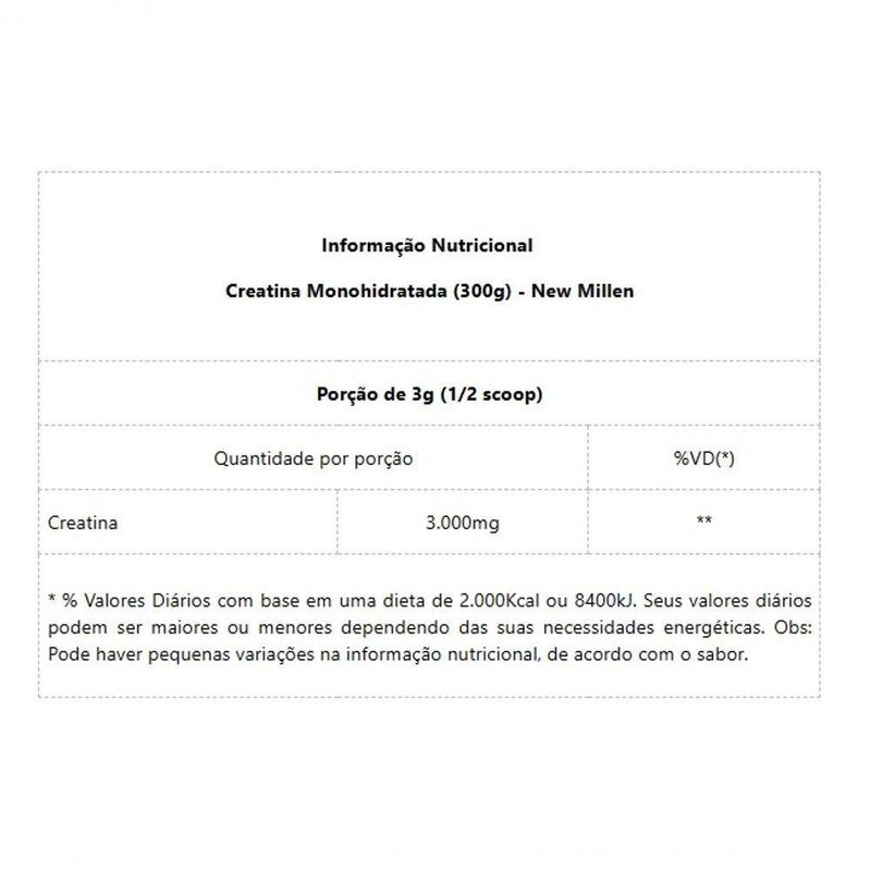 Informação Nutricional Creatina Monohidratada (300g) - New MillenPorção de 3g (1/2 scoop)Quantidade por porção%VD(*)Creatina3.000mg*** % Valores Diários com base em uma dieta de 2.000Kcal ou 8400kJ. Seus valores diários podem ser maiores ou menores dependendo das suas necessidades energéticas. Obs: Pode haver pequenas variações na informação nutricional, de acordo com o sabor.