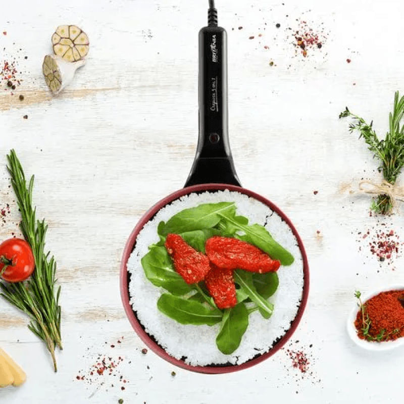 Acompanha espátula, recipiente e anel de silicone para preparo de tapiocas e omeletes; Disponível em 127V, com 800W e 220V, com 900W;