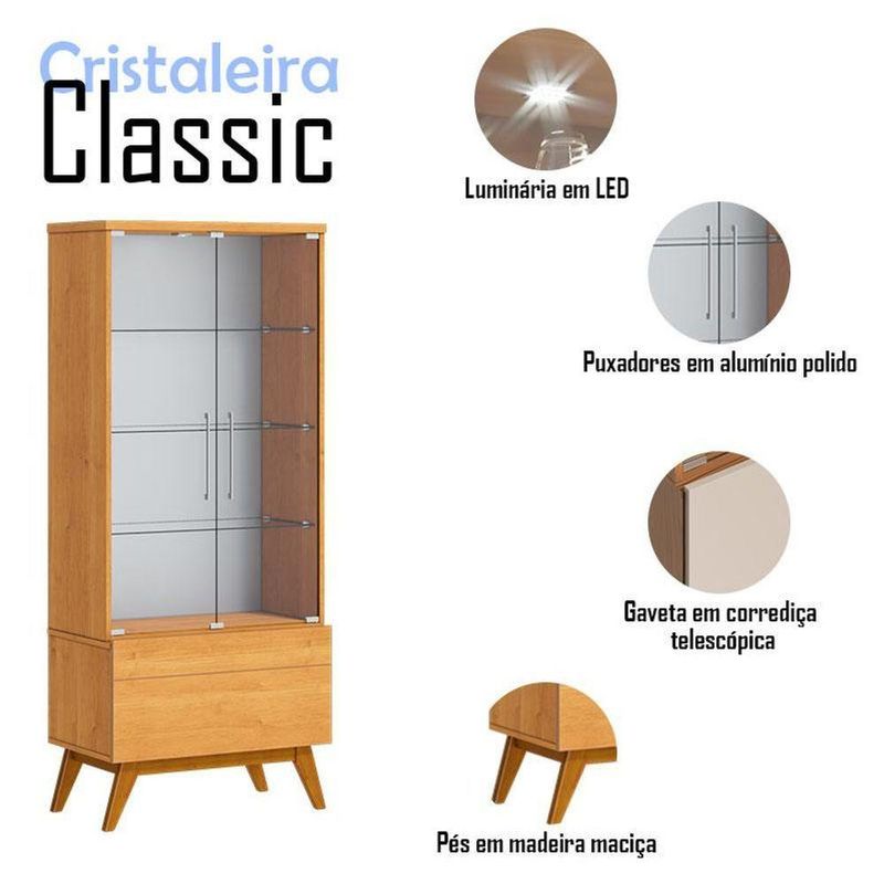 Cristaleira Ambiente Classic Nature - ImcalA cristaleira da linha Classic oferece um toque de elegância e funcionalidade para qualquer ambiente. Com duas portas em vidro, exibe seu interior de forma sofisticada. As três prateleiras também em vidro proporcionam amplo espaço para organizar seus objetos. Além disso, possui uma gaveta com corrediça telescópica, garantindo um deslize suave e fácil acesso aos seus pertences. A inclusão de uma luminária LED realça a beleza, criando um ambiente acolhedor. Produzido pela Imcal, é desenvolvido em MDP com materiais de alta qualidade garantindo mais durabilidade e resistência. Combinando estilo com design clássico será a escolha perfeita para quem busca uma peça que una organização e praticidade ao seu ambiente. Confira e garanta o seu!Características técnicas:- Pintura na cor Nature