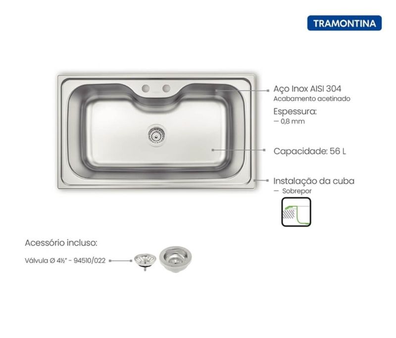 Modo de uso: Não usar ácido muriático, água sanitária ou qualquer outro solvente para lavar objetos na cuba. Nunca deixar objetos metálicos sobre a peça por períodos muito longos, para evitar a corrosão. Para manter o brilho, a Tramontina desenvolveu uma pasta especial para polir e remover manchas nos produtos de aço inox, que está disponível nos principais pontos de venda (94537000).