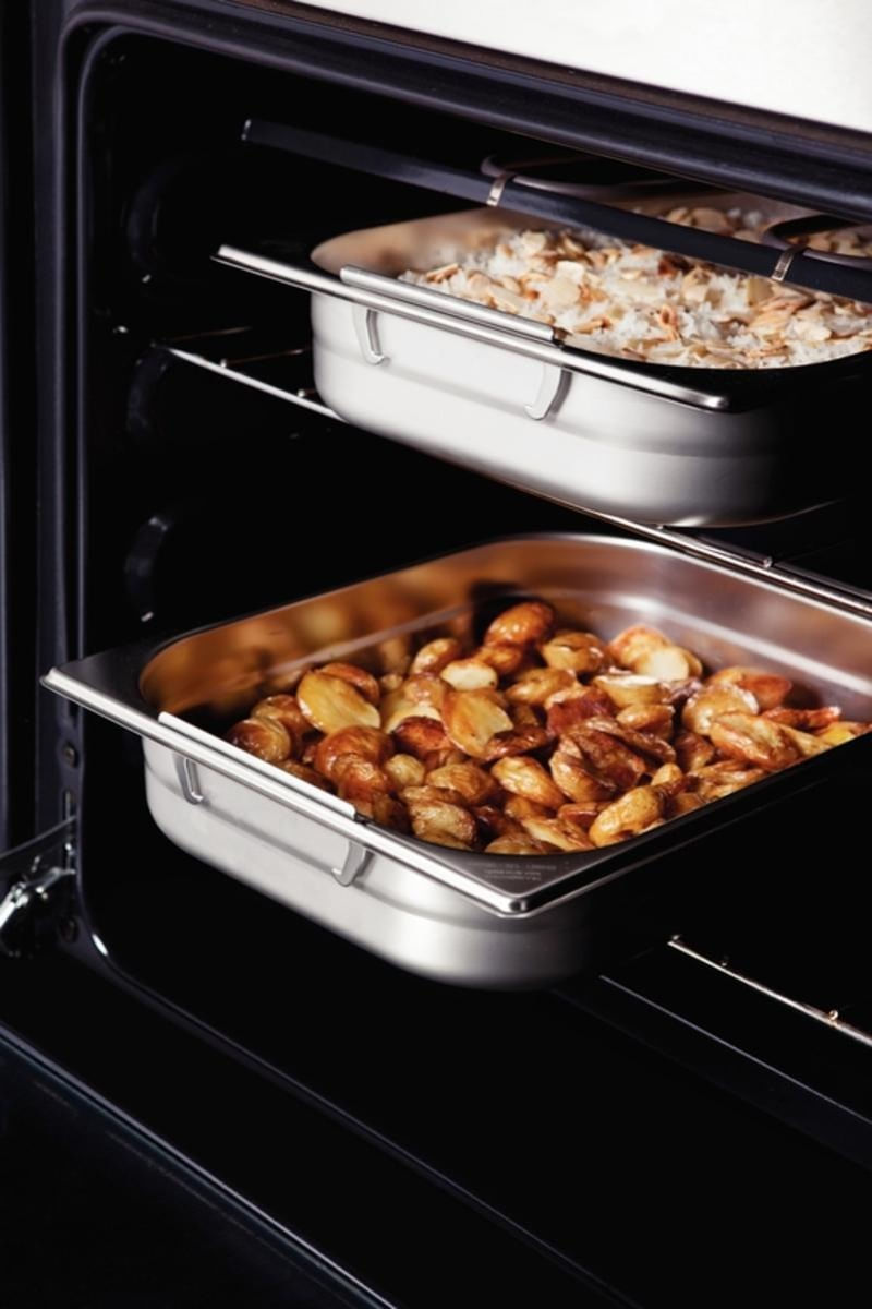 - Cantos internos arredondados e mais amplos para ajudar na limpeza e no recolhimento dos alimentos;