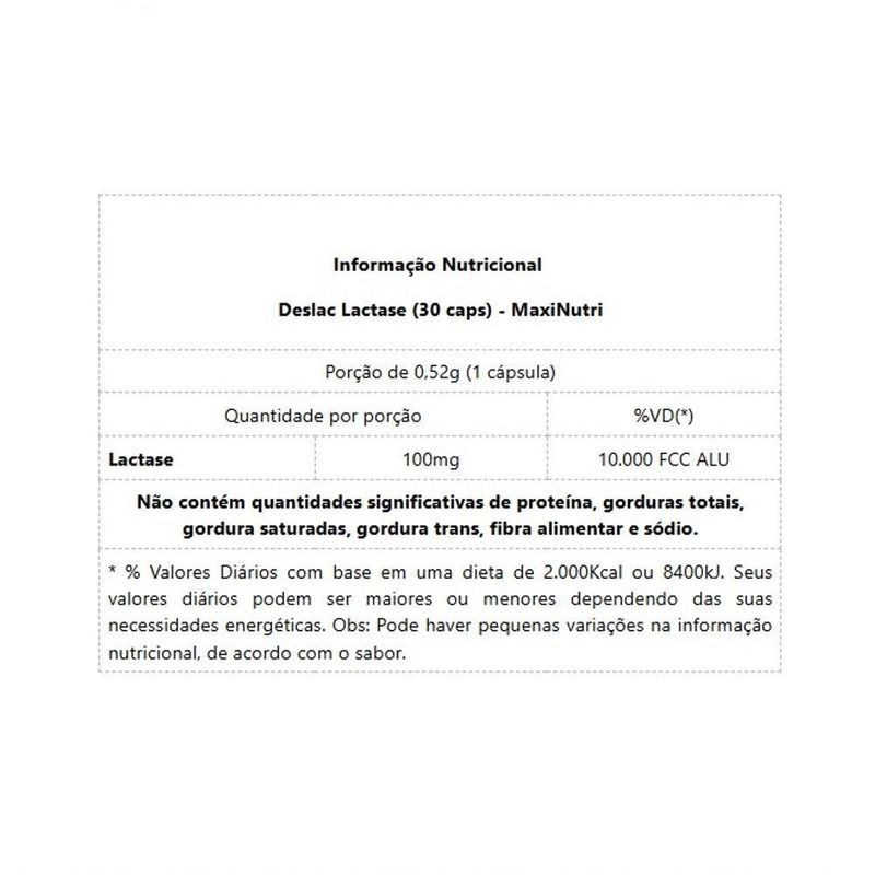 Informação Nutricional Deslac Lactase (30 caps) - MaxiNutriPorção de 0,52g (1 cápsula)Quantidade por porção%VD(*)Lactase100mg10.000 FCC ALUNão contém quantidades significativas de proteína, gorduras totais, gordura saturadas, gordura trans, fibra alimentar e sódio.* % Valores Diários com base em uma dieta de 2.000Kcal ou 8400kJ. Seus valores diários podem ser maiores ou menores dependendo das suas necessidades energéticas. Obs: Pode haver pequenas variações na informação nutricional, de acordo com o sabor.