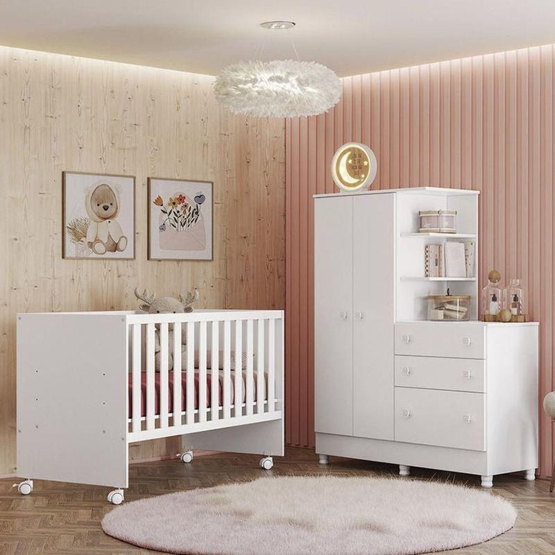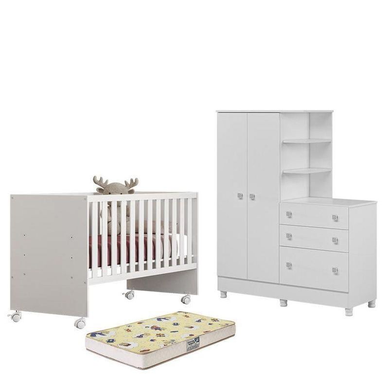 Dormitório Doce Sonho Guarda Roupa Com Cômoda Com Pés, Berço Reto Branco E Colchão Supreme - Qmovi Branco