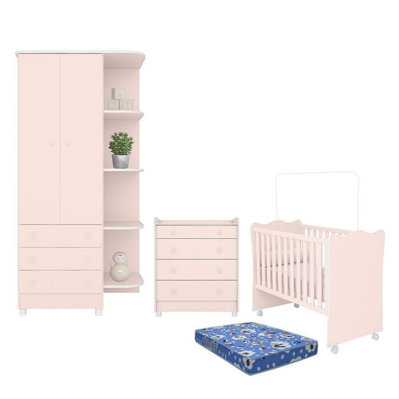 Dormitório Doce Sonho Guarda Roupa, Cômoda Trocador, Berço com Rodízio e Colchão Baby Physical - Qmovi