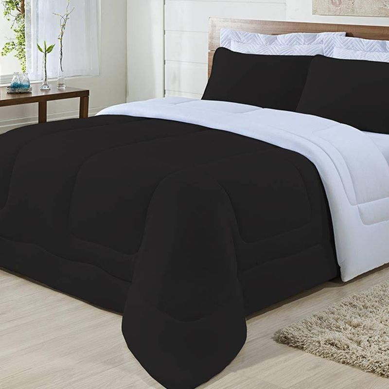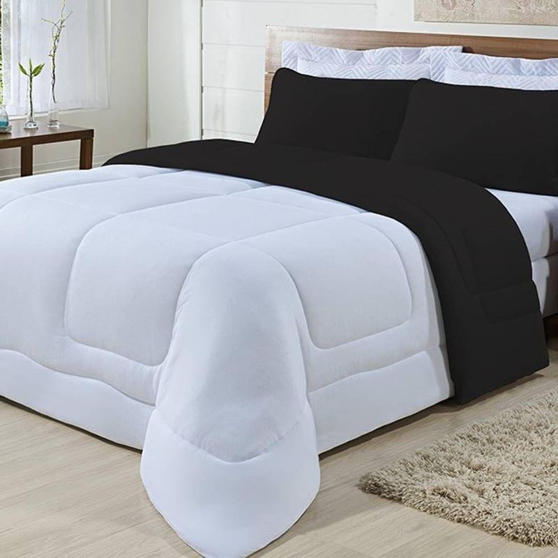 Enchimento 100% Poliéster (120 Gramas) Marca: Enxovais Davy | Estampa: Não se Aplica | Medidas: 01 Edredom King Liso 2,50m x 2,90m | Número de Peças: Avulsa | Material: Agodão | Cor Predominante: Branco/ Preto | Cama Indicada: King