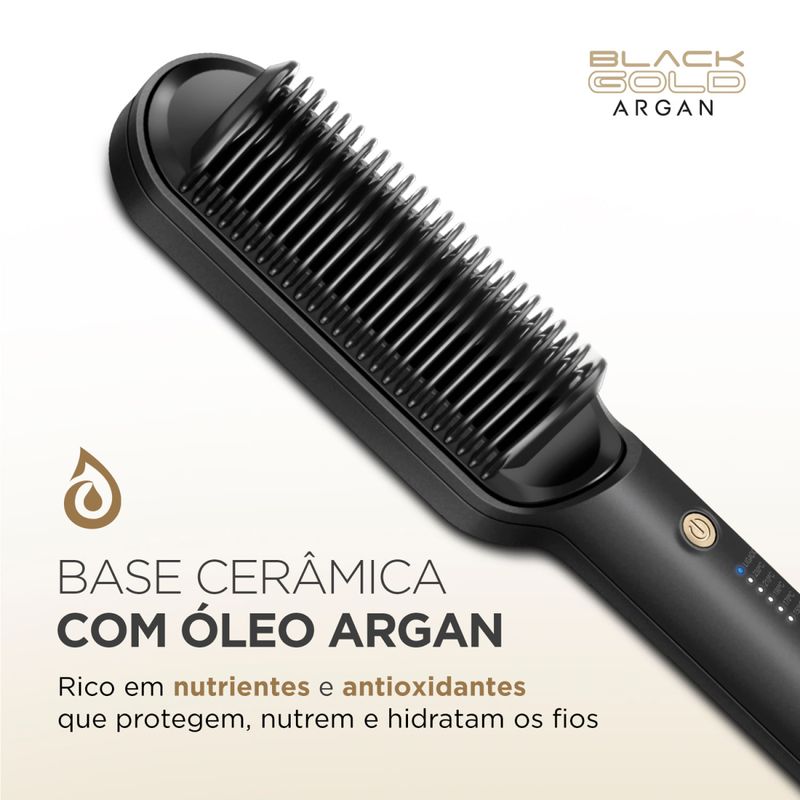 ALISAMENTO INSTANTÂNEO: As placas de cerâmica da Escova Black Gold Argan possuem tecnologia PTC, que promovem o rápido aquecimento, além de manter a temperatura estabilizada, garantindo um alisamento perfeito em uma única passada!