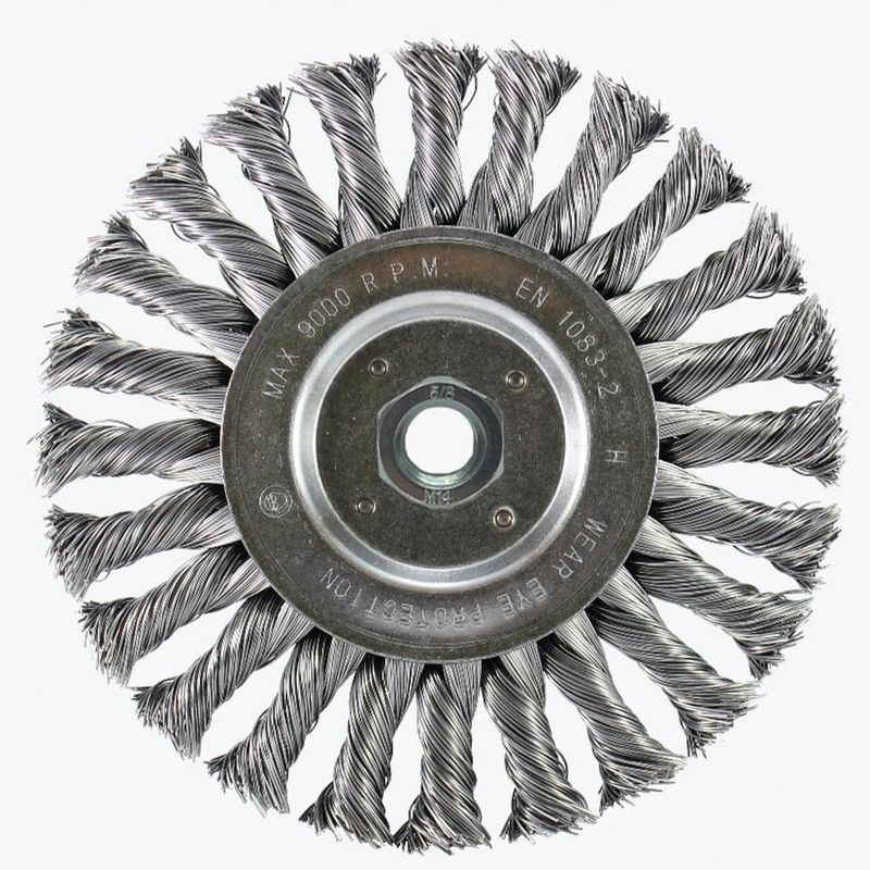 Especificações: Material: Aço Filamento: Aço Temperado Ø 0,50mm Aplicação: Remoção de carepas e respingos de cordão de solda; Rebarbação e limpeza de nível médio; Limpeza de bisel e raiz de solda; Montagem e manutenção de tubos de pipeline. Velocidade máxima: 9000rpm Rosca: M14 - 5/8"