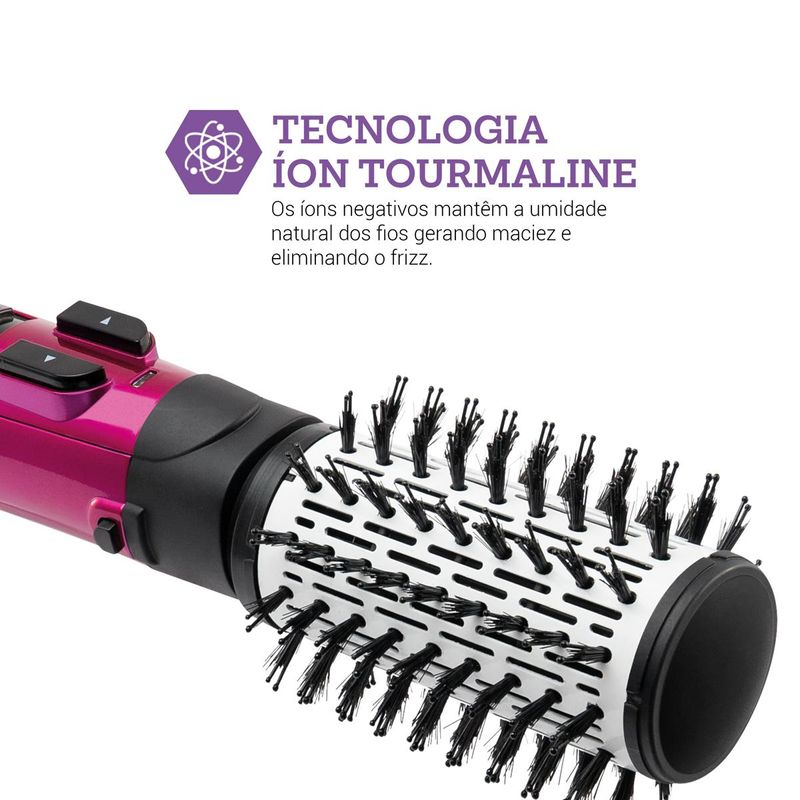 Diga adeus ao frizz! A Escova Rotativa conta com tecnologia íons Tourmaline que reduzem o frizz, fecham as cutículas, mantêm a umidade natural dos fios e garantem muito mais maciez e brilho.