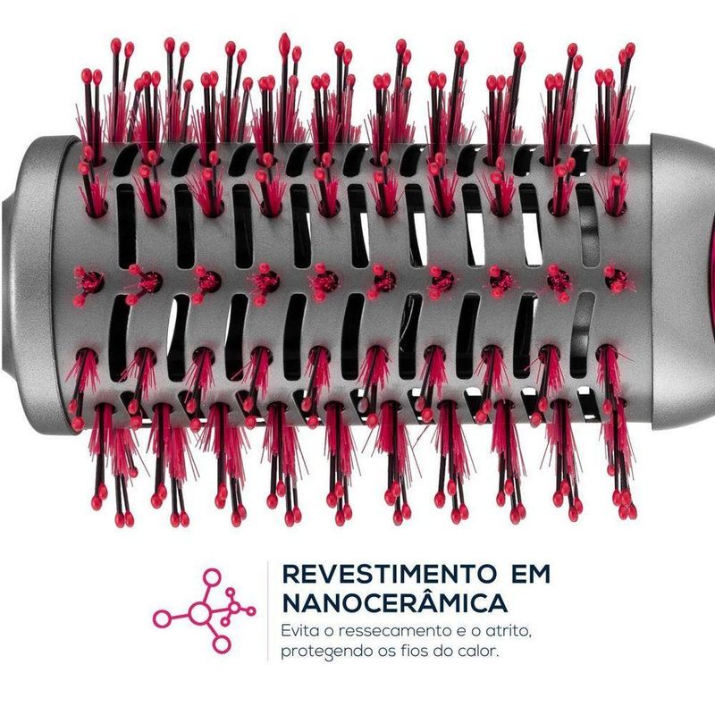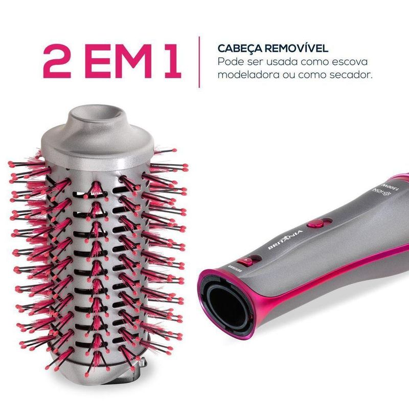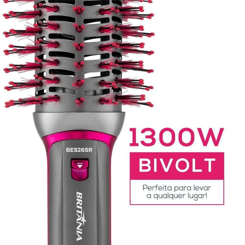 As mais queridas, secam de verdade! Seus cabelos ainda mais macios, fios modelados e impecáveis por mais tempo com a Escova Secadora Britânia 4 em 1 1300W Bivolt BES26SR.São 1300W de potência que garantem maior agilidade e eficiência! Por ser 4 em 1, ela seca, alisa, modela e dá volume aos seus fios! É muito mais versatilidade na hora de cuidar dos seus cabelos e fazer penteados.Com cabeça redonda e removível, a Escova Secadora pode ser utilizada como secador. E por possuir cerdas duplas, em dois tamanhos e tipos diferentes, ela se adapta a todos os tipos de cabelos, aderindo melhor aos fios.Além disso, a Escova Secadora Britânia dá um show de tecnologia. Equipada com revestimento em nanocerâmica, evita o ressecamento e o atrito protegendo os fios do calor.Uma Escova Secadora versátil, com 2 temperaturas + 2 velocidades e jato de ar frio que ajuda a finalizar os penteados.Efeito de salão nos cabelos? Tenha a Escova Secadora Britânia BES26SR 4 em 1 1300W Bivolt.Principais Características:- Produto bivolt