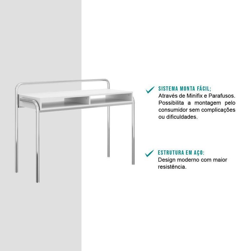 Escrivaninha Branca Tubos Cromados CarraroA Escrivaninha Carraro possui design contemporâneo e acabamentos modernos. Pode ser utilizado em pequenos ambientes corporativos, home office ou até em um espaço destinado ao escritório/estudo dentro do dormitório.