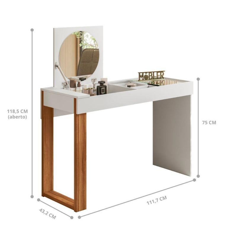 Transforme seu quarto em um verdadeiro refúgio de beleza e organização! Nossa escrivaninha multifuncional é a peça-chave que você precisa para criar um ambiente elegante e funcional. Com espelho, porta-joias e diversos compartimentos, ela oferece tudo o que você precisa para cuidar de si mesma e deixar seus pertences sempre à mão. Não perca essa oportunidade e garanta já a sua!Medidas da Penteadeira:Altura: 75 cmLargura: 111,7 cmProfundidade: 43,2 cmInformações da Penteadeira:Cor: BrancoMaterial: MDPGavetas: NãoPés: Sim (3)Espelho: SimLED: NãoPorta Joias: Sim(2),um repartido repatirdo em 2 espaços e o outro sem divisória possui espelho na parte interna do tampoItens Inclusos:1 Escrivaninha PenteadeiraManual de MontagemKit completo para montagem e manual de instruçõesGarantia:3 meses contra defeito de fabricaçãoInformações Adicionais:- Fotos meramente ilustrativas do produto no ambiente.- Os objetos que ambientam as fotos não acompanham o produto;- Verificar descrição e tamanho do produto antes da compra.- Avaliar a mercadoria no ato do recebimento e recuse em caso de divergência ou danos.- Mantenha as informações de contato e endereço de entrega atualizados para entrarmos em contato caso necessário.- Limpar com flanela ou pano macio seco, não utilizar produtos abrasivos, desengordurantes, álcool ou solvente. Não expor o produto diretamente à luz solar e à umidade.- Sugerimos a contratação de um montador profissional para a montagem do produto. Não nos responsabilizamos por danos causados no ato da montagem.- Não nos responsabilizamos pela montagem e desmontagem do produto no ato da entrega e devolução, assim como os custos gerados nestas situações.- A transportadora entregará o produto no andar térreo do endereço de entrega.- Não nos responsabilizamos por subir escadas, corredores e elevadores ou transporte por guincho em apartamentos. ALTURA DO PRODUTO (CM): 75 | COMPRIMENTO DO PRODUTO (CM): 43,2 | COMPRIMENTO PRODUTO COM EMBALAGEM (CM): 50,8 | LARGURA DO PRODUTO (CM): 111,7 | Quantidade de caixas de embalagem: 1 | Materiais da escrivaninha: MDF | Requer montagem: Sim | É em forma de L: Não | Largura: 111,7 cm | Comprimento: 43,2 cm | Profundidade: 43,2 cm | Altura: 75 cm | ESTADO DE ORIGEM: PR | FORMATO: Retangular | INSTRUÇÕES/CUIDADOS: Limpar com flanela ou pano macio seco, não utilizar produtos abrasivos, desengordurantes, álcool ou solvente. Não expor o produto diretamente à luz solar e à umidade. | CONTEÚDO DA EMBALAGEM: 1 Escrivaninha | LARGURA PRODUTO COM EMBALAGEM (CM): 129 | MARCA: Mobler | MATERIAL PARA FILTRO: Madeira | MATERIAL PRINCIPAL: MDP | PESO DO PRODUTO (KG): 21,2 | PESO PRODUTO COM EMBALAGEM (KG): 22 | PRODUTO: Escrivaninha | PRODUTO PRECISA DE MONTAGEM?: Sim, mas sugerimos a contratação de um montador profissional para a montagem do produto. Não nos responsabilizamos por danos causados no ato da montagem. | CÔMODO INDICADO: Quarto | QUANTIDADE DE GAVETAS: 0 | QUANTIDADES DE CAIXAS DE EMBALAGEM: 1 | COR PREDOMINANTE: Cinamomo | ALTURA DO PRODUTO COM EMBALAGEM (CM): 7,9 | DESCRIÇÃO DO TAMANHO: 75x111,7x43,2 | CORES DO PRODUTO (FILTRO DE CORES): Marrom Claro