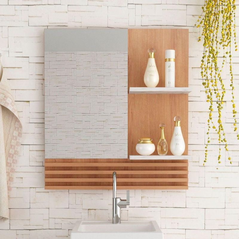 Espelheira Para Banheiro 60 Cm 2 Prateleiras Sâmia Amêndoa/mármore Branco