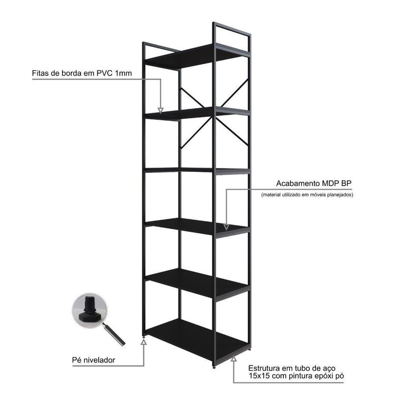 Estante Alta C/06 Prateleiras 185x60x33cm Yon Preto Tx/ Preto Tx/