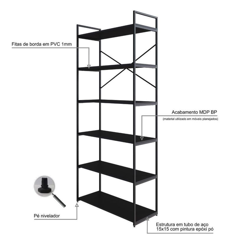 Estante Alta C/06 Prateleiras 185x80x33cm Yon Preto Tx/est.preta Preto Tx/est.preta