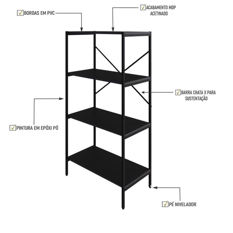 Estante C/04 Prateleiras 118x60x33cm Tub Tueh1164 Preto ônix - Preto ônix /