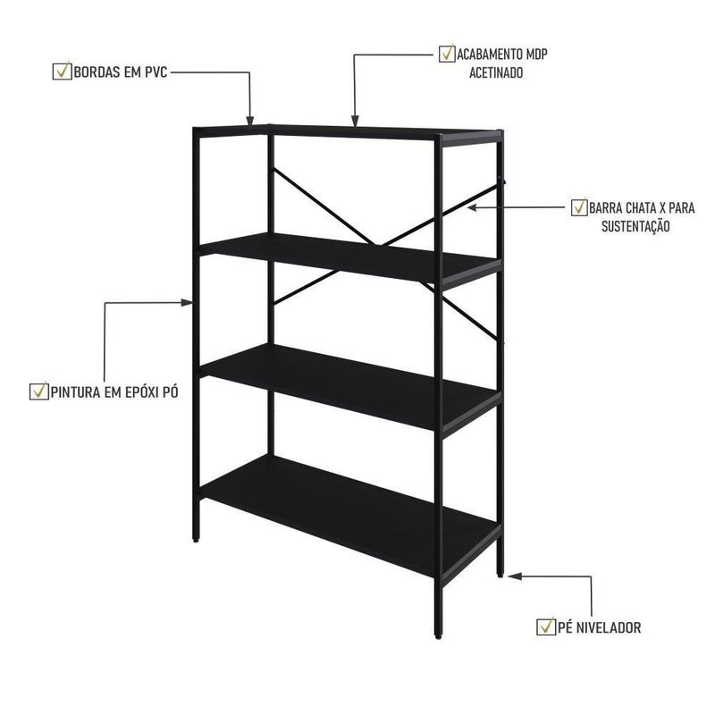 Estante C/04 Prateleiras 118x80x33cm Tub Tueh1184 Preto ônix - Est.preta Preto ônix / Est.preta