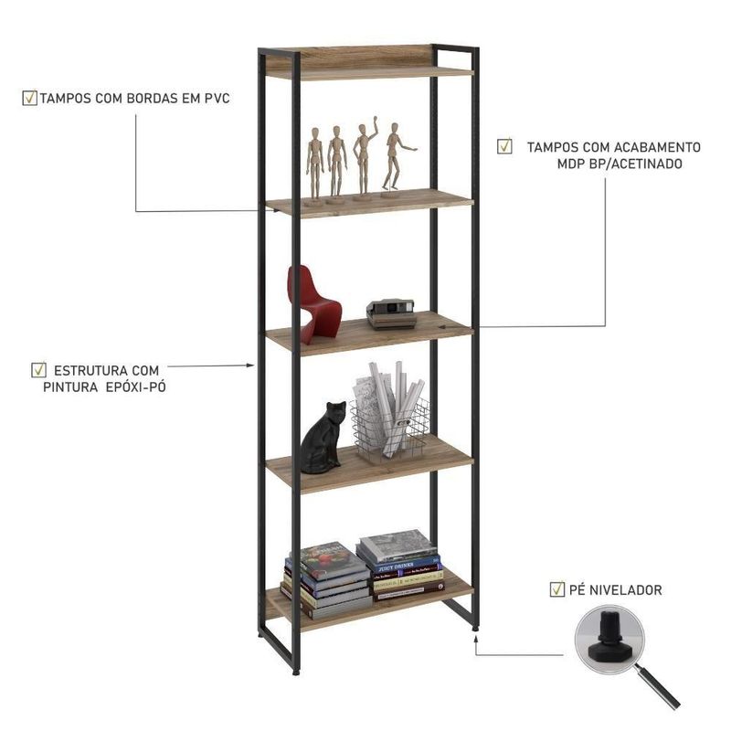Estante Dynamica 60x30x187cm C/05 Prateleiras Carvalho / Est.preta Carvalho / Est.preta