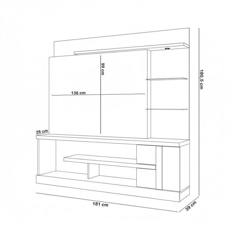 Espaço livre para a TV (L x A x P): 136 x 99 x 26 cm.