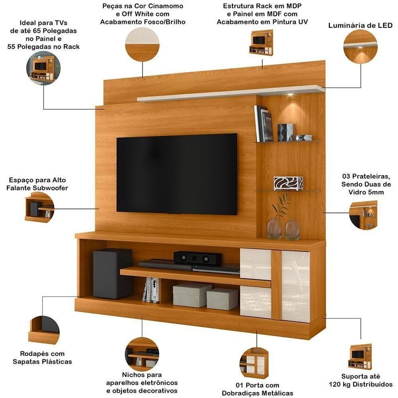 Essa estante para sala combina a funcionalidade de um home theater - com espaço para subwoofer e aparelhos - com a magia da iluminação. Além disso, seus itens ficarão protegidos no compartimento, enquanto as prateleiras de vidro ganham vida com o LED integrado, criando uma atmosfera envolvente seja para expor seus objetos decorativos, seja para suas sessões de cinema. Para completar, o painel para TV suporta telas de até 55 polegadas, deixando o espaço ainda mais imponente.