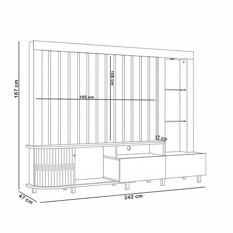 - Confira as dimensões do produto e certifique-se de que passará normalmente por supostos elevadores, portas, escadas e/ou corredores de sua residência. Material das corrediças: Metálicas Telescópicas | Largura: 242 cm | Material da estrutura: MDP | Tamanho máximo de TV: 70 Polegadas | Peso: 97 kg | Quantidade de prateleiras: 2 | Formato do móvel: Estante Home Theater | Color: Cinamomo Off White | ColorFamily: Marrom | ColorSimple: Marrom | ColorSupplier: Cinamomo Off White | MaterialFamily: MDP | OriginCountry: Nacional | OriginState: PR | ProductContents: 01 Estante Home Theater | ProductHeight: 187 cm | ProductLength: 47 cm | ProductWeight: 97 kg | ProductWidth: 242 cm | SizeDescription: Largura: 242 cm x Altura: 187 cm x Profundidade: 47 cm | SupplierSimpleName: Estante Painel Para TV 70 Pol Com LED 242cm Hector M07 Cinamomo Off White - Lyam Decor | Material: MDP | Altura: 187 cm | Com compartimento para alto-falantes: Não | Quantidade de gavetas: 1 | Requer montagem: Sim | Quantidade de portas: 1 | ProductWarranty: 90 dias após o recebimento do produto | Com rodas: Não | Materiais do corpo: MDP | ProductInstructions: Produto para uso em ambiente interno, nao devendo ficar exposto ao sol, calor e umidade excessivos. | Profundidade: 47 cm | Cinamomo Off White