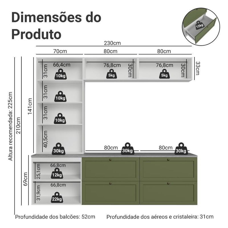 - 52cm de profundidade nos balcões e 31cm nos aéreos e cristaleira