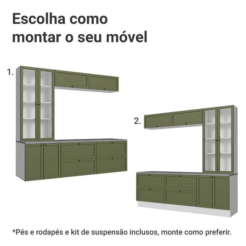 O conjunto é composto por gavetas e armários amplos, um armário com portas de vidro, que pode ser como cristaleira ou livreiro. Essa combinação permite acomodar uma , organizar livros, louças e itens decorativos com facilidade. O acabamento da estrutura é em Branco e das frentes em Verde, possui alta resistência, trazendo um visual sofisticado e textura suave ao toque.